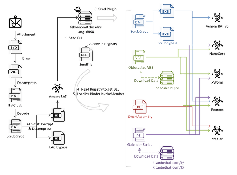 Cybersecurity researchers recently uncovered a complex multi-stage attack that targets users with invoice-themed phishing emails to deploy a variety of malware, including Venom RAT, Remcos RAT, XWorm, NanoCore RAT, and a crypto wallet stealer. Attackers attach Scalable Vector Graphics (SVG) files to emails, which initiate the malware infection process upon opening, according to a technical report by Fortinet FortiGuard Labs.